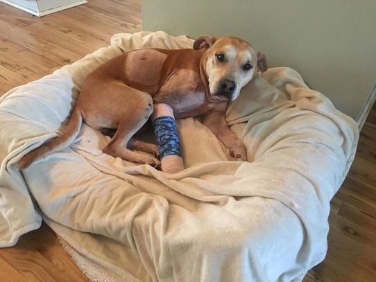 Scout was hit by car and left on side of road. The shelter staff called one of our officers to ask her to take Scout in as a Hospice patient because they thought she wasn't going to make it due to kidney failure and she had injuries from car. We brought her to vet and they said she was okay, but her leg was severely injured and nerves were severed. She just dragged the leg so they said amputation would be best. Our board member has had since 2017 she was 9 at the time she was injured! She was microchipped but the info wasn't current. Our board member who was fostering her ended up adopting her!
